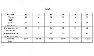 Костюм в спортивном стиле состоит из майки и брюк. Брюки полуприлегающего силуэта, с лампасами из отделочного полотна вдоль боковых швов, на поясе, с боковыми карманами, с резинкой в нижней части. На передней половине брюк, вдоль пояса, заложены по две складки. Майка полуприлегающего силуэта длиной до середины бедра, с V-образной горловиной, с кокетками из сетки, без рукавов. Вдоль боковых швов расположены вставки из основного полотна. В верхней части спинки обработана фигурная кокетка из сетки. Горловина и проймы обработаны бейкой из отделочного полотна. для дома и сна