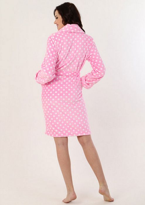 Мягкий домашний халатик из трикотажного полотна велсофт. Полуприлегающего силуэта, длинной выше уровня колена. Изделие с воротником шаль и накладными карманами. Рукав втачной базового, покроя три четверти на манжете.