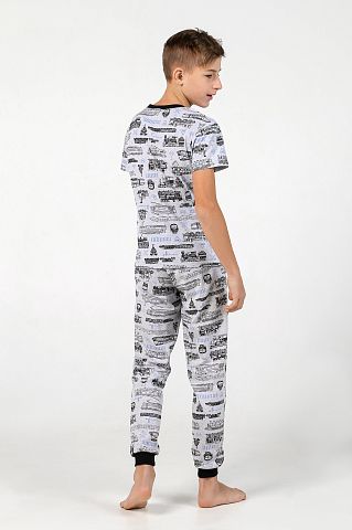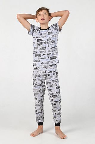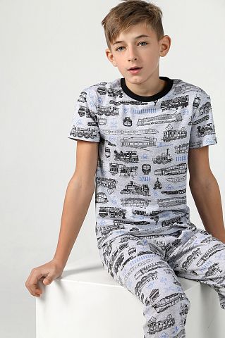 Костюм для мальчика, состоящий из футболки и брюк из полотна с эксклюзивным рисунком. Футболка с принтом, со слегка спущенной линией плеч, по горловине - деталь из рибаны. Брюки с эластичной тесьмой по линии талии, на манжетах из рибаны по низу.
