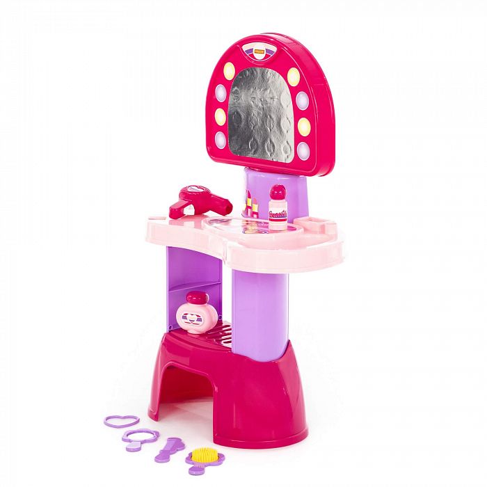 Салон красоты состоит из туалетного столика и аксессуаров. Под столиком расположена большая полочка для парикмахерских принадлежностей. Хранить детскую косметику и украшения также можно на столешнице. Зеркало абсолютно безопасно, так как вместо стекла здесь используется пластик. В комплект аксессуаров входят: