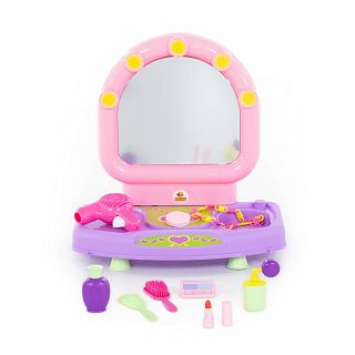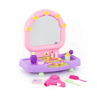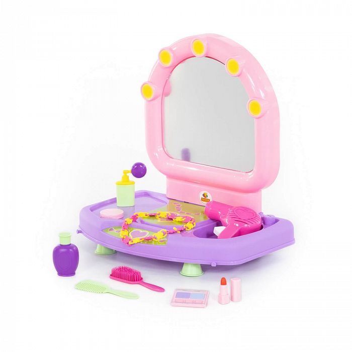 Настольный салон красоты для маленьких красавиц представляет собой туалетный столик с зеркальцем. В набор входят игрушечные принадлежности: фен, расчески (2 шт.), ожерелье, пудреница, тени для век, помада, флакончики для косметических средств. С помощью набора маленькая модница сможет организовать свой салон красоты и примерить на себя роль парикмахера, визажиста или стилиста. Размер в упаковке: 45х36х13 см. Цвета предметов в наборе могут быть иными, чем на фото. Но все столь же яркие и жизнерадостные
