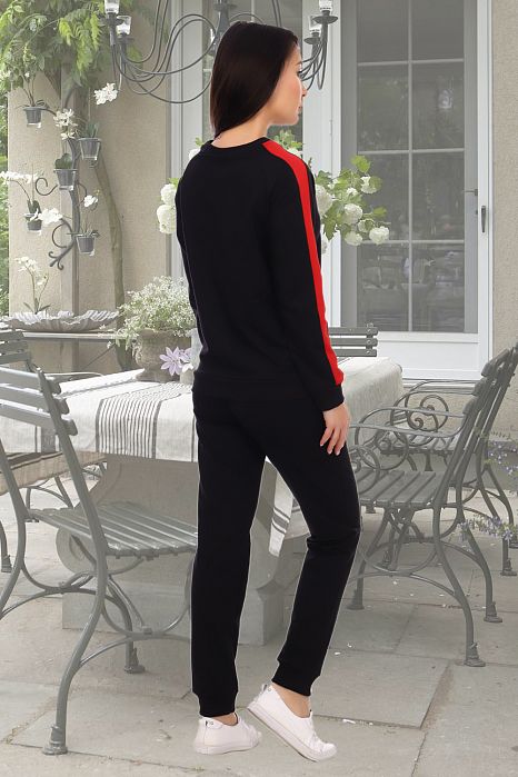 Футер с лайкрой 2-х нитка пенье. Костюм спортивный - толстовка прямого покроя, с красными полосами на рукавах, брюки прямые, внизу манжет.