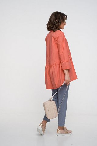 Особенности: Стильная туника с рубашечным воротником. Потайная застежка планка. На груди карман. По переду изделия сделаны подрезы со вставкой -оборкой по всему изделию. По оборке есть средний шов сзади. Спинка без вытачек, отрезная. Рукав втачной, длиной 7/8, с застроченной декоративной складкой. Спинка изделия удлиненная на 9см. Отличное сочетание с джинсами, джеггинсами и юбкой карандаш.