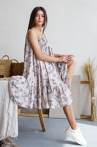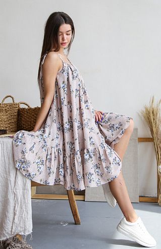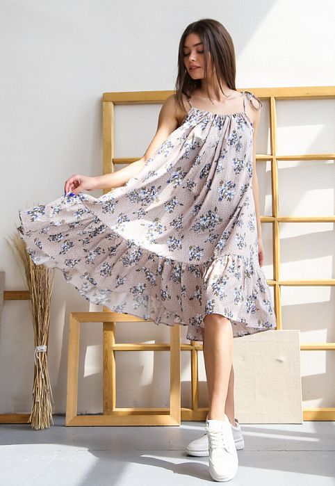 Особенности: Легкая и летящая модель сарафана как нельзя лучше подойдет для жарких летних дней. На завязывающихся бретелях по плечам, полочка и спинка изделия собраны на бретели, без вытачек. По низу изделия выполнен волан. Свободный крой и облегченная ткань сарафана обеспечивает свободу действий и циркуляцию воздуха - это даст ощущение полного комфорта! Одно из лучших решений для лета!