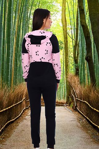 Ткань: футер вискозный. Костюм молодежный полуприлегающего силуэта. Олимпийка из ткани двух расцветок, с застежкой на молнию и двумя карманами на молнии. Капюшон с декоративными ушками. Рукав реглан, на манжете. Брюки на кокетке, с двумя карманами, на манжете.