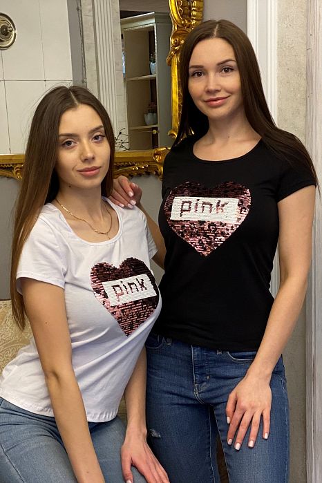 На футболке расположены двусторонние пайетки (меняется цвет, рисунок остается таким же).