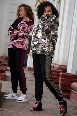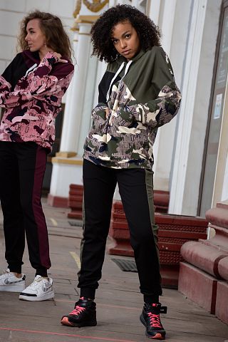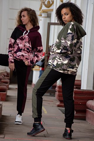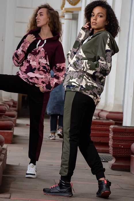 Ткань: футер с лайкрой 2-х нитка. Костюм состоит из толстовки и брюк. Брюки на поясе, с карманами, с лампасами из отделочного полотна вдоль боковых швов, на эластичном манжете внизу. Толстовка прямая, свободная, с капюшоном, на поясе, длиной до середины бедра. Рукав длинный. Полочка разделена асимметричными линиями на части из отделочных контрастных полотен. На полочке обработан карман "кенгуру".