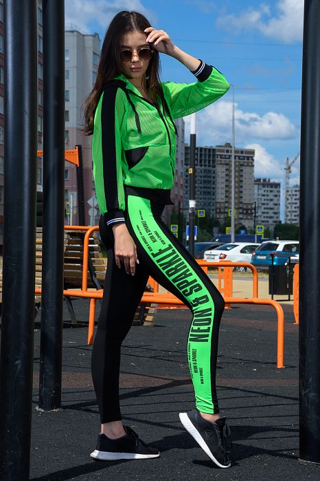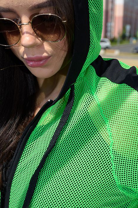 Толстовка с капюшоном из сетки, длиной до середины бедра. Рукав реглан длинный, из сетки, с контрастным лампасом вдоль рукава, на эластичном манжете. На полочке расположены фигурные карманы из сетки.