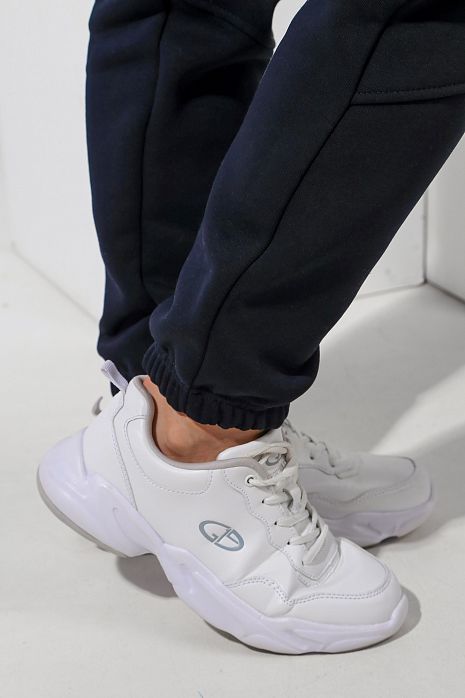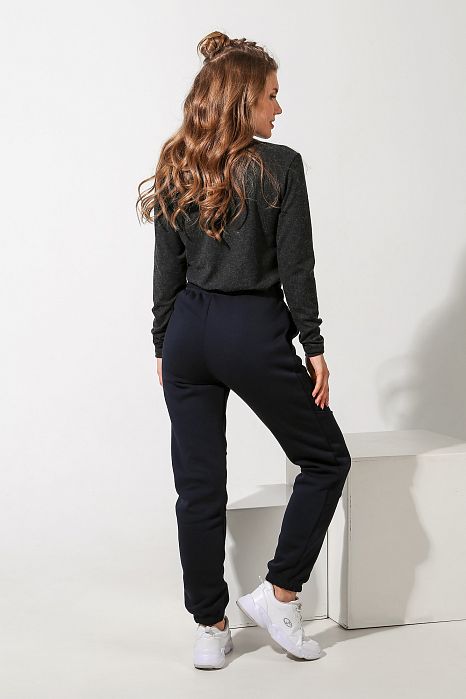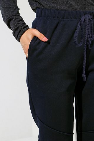 Из трикотажного меланжированного полотна «футер-трехнитка», длинные, с карманами в боковых швах и эластичной тесьмой по талии. Передние половины – из трех частей каждая. Нижние срезы обработаны подгибкой с эластичной тесьмой. В подгибку верхнего среза через две обметанные петли для регулирования степени прилегания брюк по талии вставлен шнур, завязывающийся спереди.