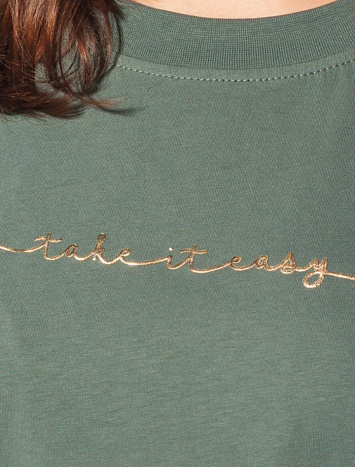 Футболка over-size кроя из премиального хлопка. Минималистичный принт серебряной фольгой - надпись "take it easy". Изделие украшено металлическим логотипом бренда. Самое высокое качество хлопковых волокон с добавлением эластана. Идеально держит форму и сохраняет внешний вид в течение договременного использования.
