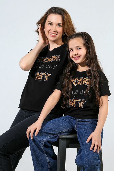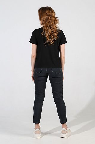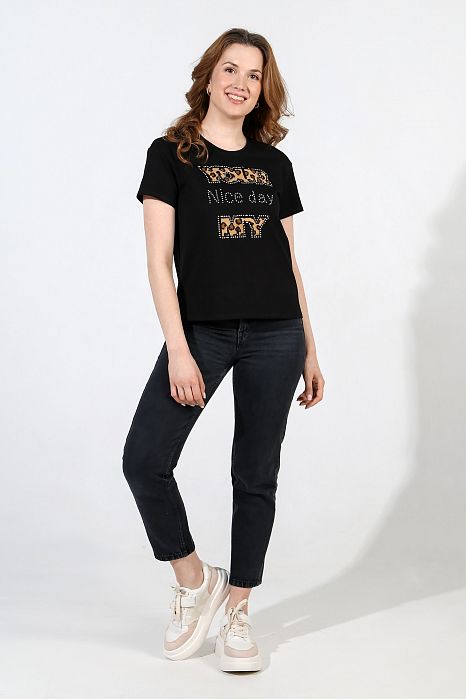 Футболка женская из х/б полотна с лайкрой. Модель с аппликацией, со слегка спущенной линией плеч, короткими рукавами.