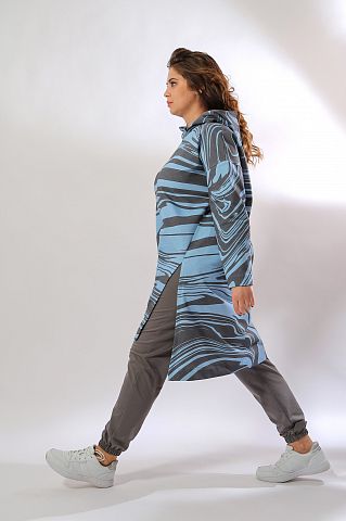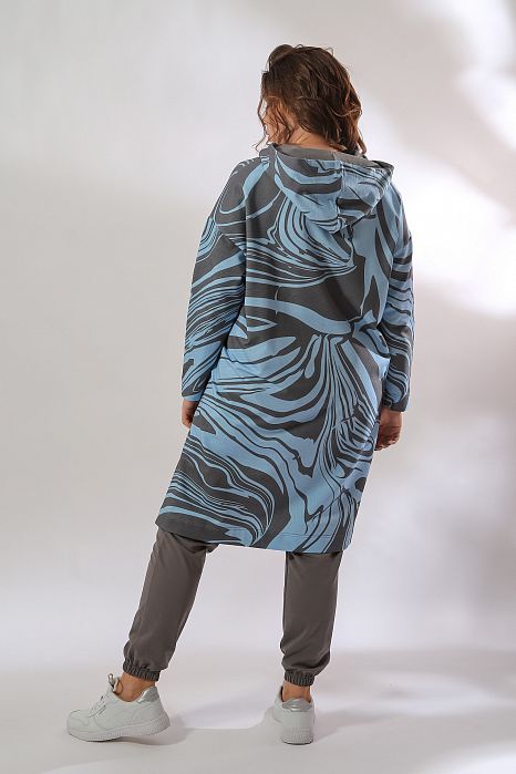 Костюм Хелена-2 выполнен из трикотажного полотна футер-двухнитка «пенье». Состоит из худи-платья и брюк.