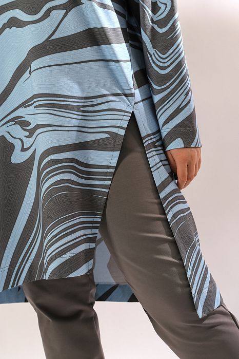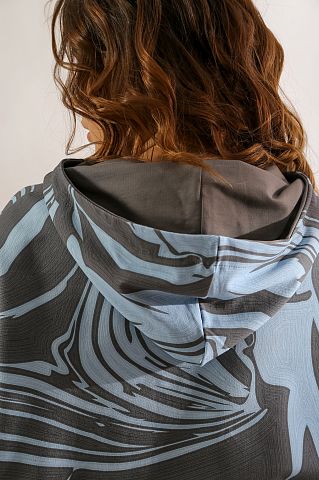 Худи выполнена в стиле «оверсайз», очень свободного покроя, прямого силуэта. С длинными рукавами на основе цельнокроеных, капюшоном на подкладке из гладкокрашеного полотна, карманом в правом боковом шве и разрезом в левом. Левый боковой шов расположен наклонно в сторону переда. Разрез имеет форму острого угла. Худи выполнена из полотна с рисунком «диджитал» - это рисунок, нанесенный на ткань особым способом - прямой цифровой печатью. Рисунок напоминает срез натурального камня.