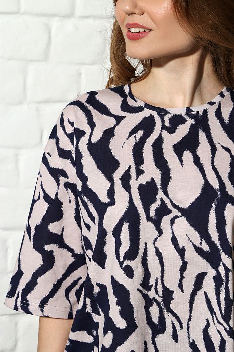 Футболка-100% хлопок /Велосипедки-92% вискоза,8% лайкра. Из трикотажного полотна «кулирка» в комбинации двух видов, сочетающихся по цвету: с набивным рисунком и гладкокрашеного вискозного, состоящий из удлиненной футболки и велосипедок. Футболка – удлиненная, свободного покроя, со спущенным плечом и втачными рукавами длиной до локтя. Горловина овальной формы обработана притачной бейкой. Велосипедки – из гладкокрашеного вискозного полотна, классического покроя, с эластичной тесьмой по талии.