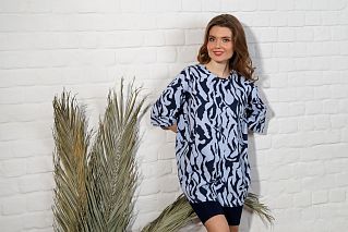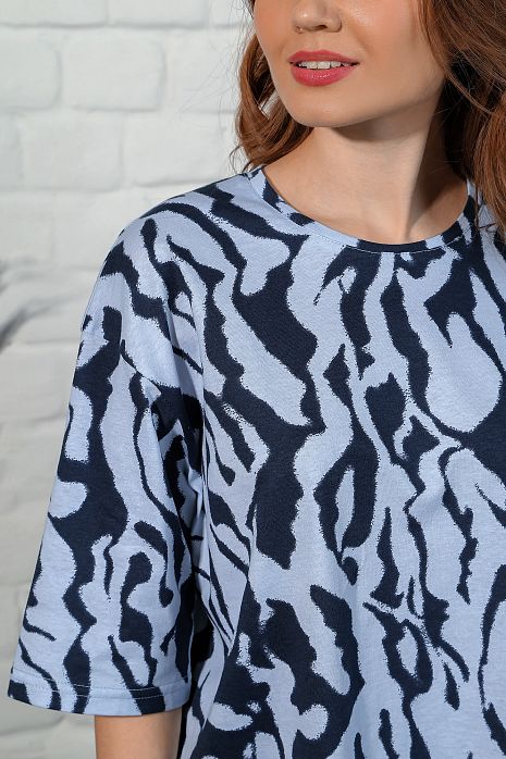 Футболка-100% хлопок /Велосипедки-92% вискоза,8% лайкра. Из трикотажного полотна «кулирка» в комбинации двух видов, сочетающихся по цвету: с набивным рисунком и гладкокрашеного вискозного, состоящий из удлиненной футболки и велосипедок. Футболка – удлиненная, свободного покроя, со спущенным плечом и втачными рукавами длиной до локтя. Горловина овальной формы обработана притачной бейкой. Велосипедки – из гладкокрашеного вискозного полотна, классического покроя, с эластичной тесьмой по талии.