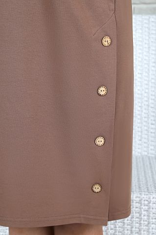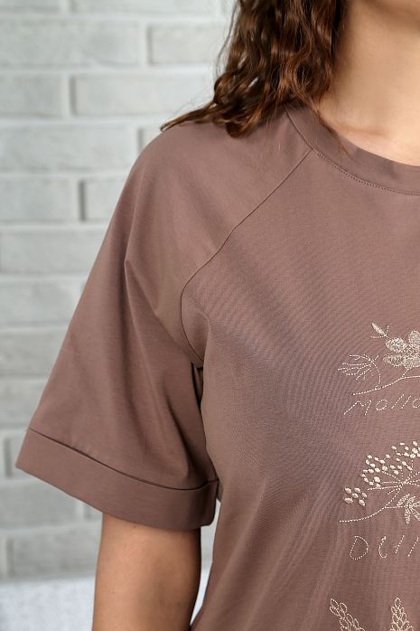 Туника женская из гладкокрашеного трикотажного полотна «кулирка» с лайкрой, прямого силуэта, с короткими рукавами «реглан», горловиной овальной формы, окантованной основным материалом и вышивкой в центре переда. В левом боковом шве – имитация шлицы с декоративными пуговицами. Низ рукавов обработан с притачными манжетами-отворотами.