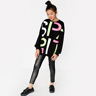 Декорирован ярким текстовым принтом с крупными буквами во всю переднюю часть.