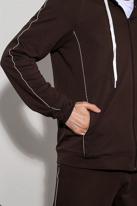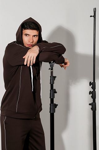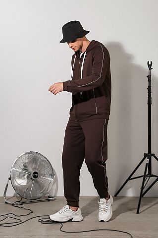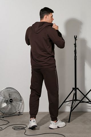 Костюм мужской из футера с лайкрой. Джемпер на застежке "молнии", с капюшоном, с карманами в рельефах полочек, рукавами покроя "реглан", на манжетах. Брюки с боковыми карманами, на манжетах, на притачном поясе с отстроченной эластичной тесьмой и внутренним шнуром для регулировки плотности посадки на талии.