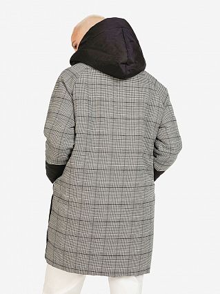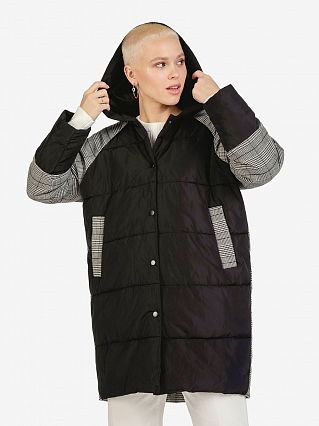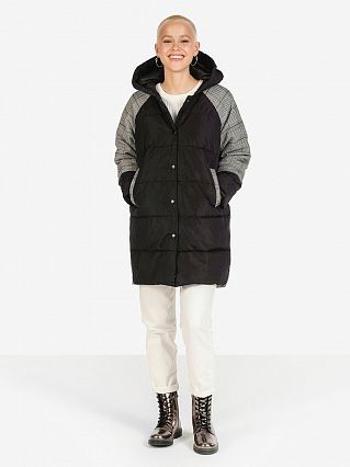 Длина по спинке - 83 см. Черная ткань- полиэстер , клетчатая ткань - вискоза. Сезон: евро-зима, то есть на осень и нехолодные зимние дни.